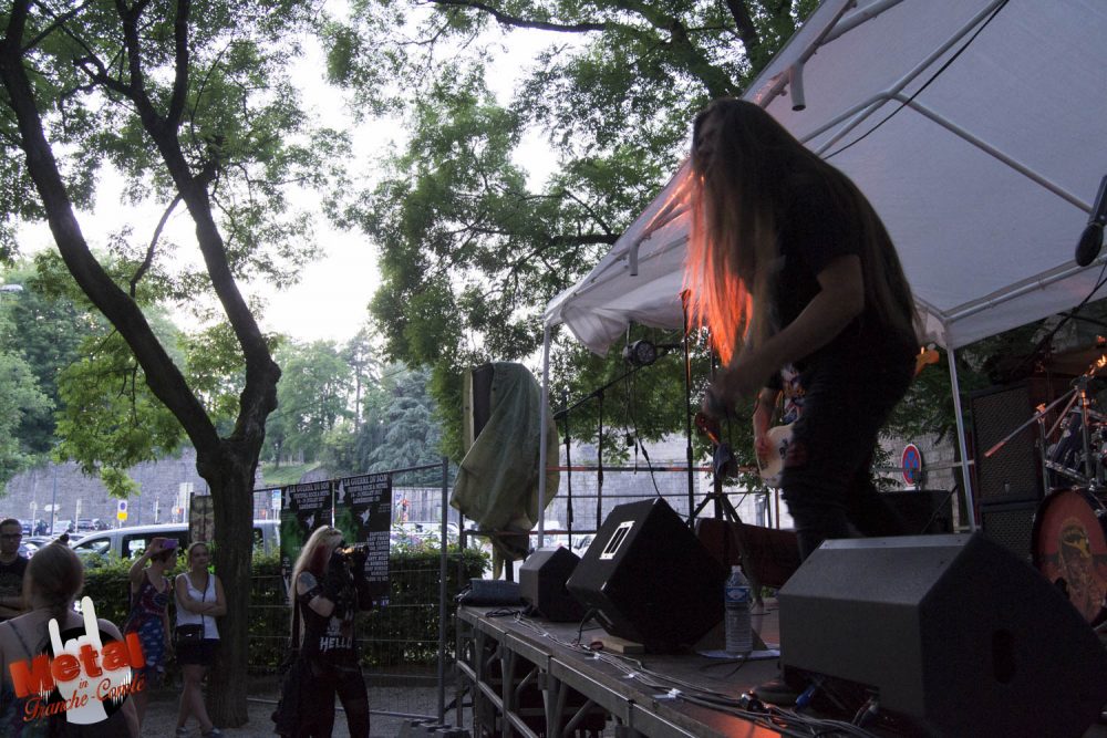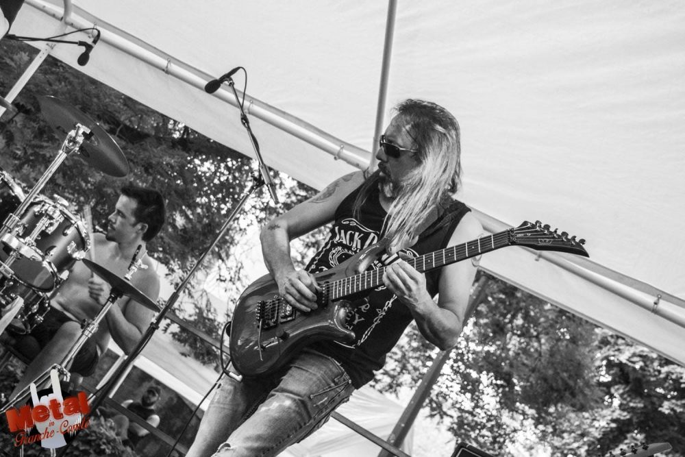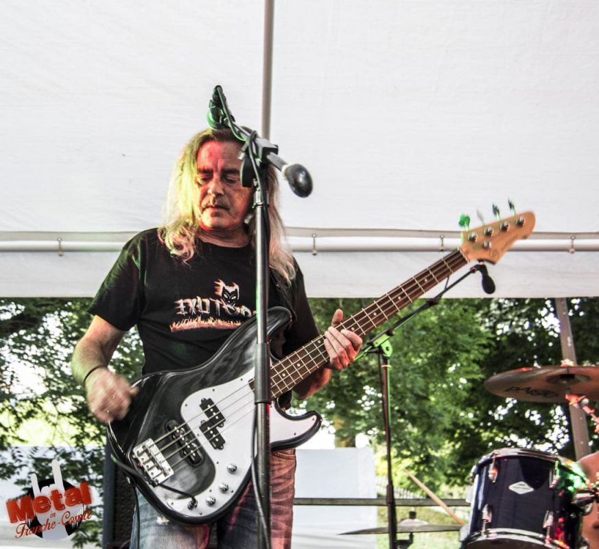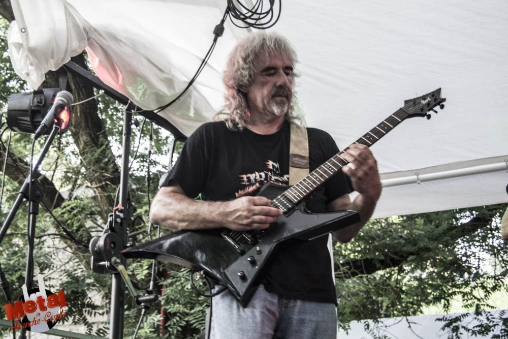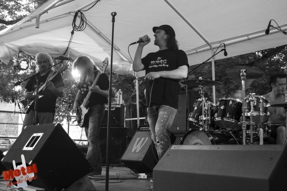Enchainons avec Exutoires, groupe de Hard Rock 80 de demain (ce n’est pas moi qui le dit c’est sur l’affiche). Une belle brochette de musicien venant tout droit des années 80 justement, mais dont le style n’a pas pris une ride ! Pour un groupe dont la moyenne d’âge … euh non j’ai rien dit … je disais donc que pour un groupe qui a de la bouteille, la puissance et la hargne sont toujours là, ils se donnent à fond, envoient les morceaux à la vitesse du son. Coté musique justement, on sent bien les influences Heavy Metal des Maiden, Helloween mais avec ce chant français comment ne pas penser à Sortilège, Vulcain, Blaspheme. Alors même si je reste peu friand du Heavy en Français, j’ai passé un bon moment.