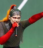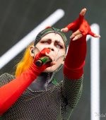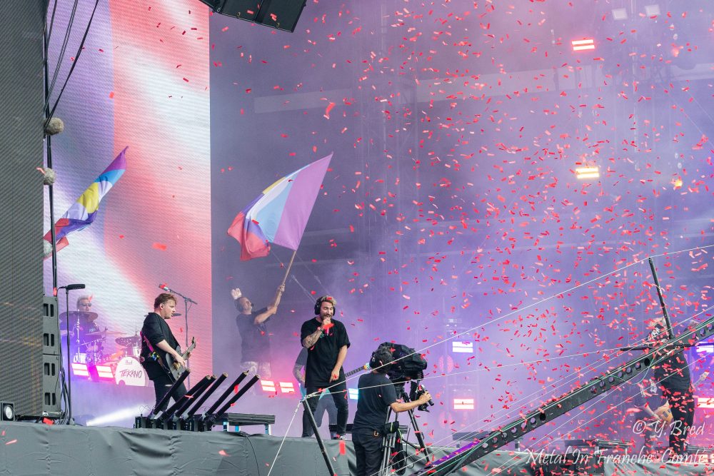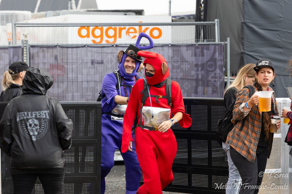 Cette distribution de poutres tranche avec le set de la MAINSTAGE suivant. Le public se remplit petit à petit de perruques frisées et de jogging fluo. On s’attend à voir Véronique et Davina débouler sur scène, mais ce sont les ELECTRIC CALLBOY (anciennement ESKIMO CALLBOY) qui apparaissent. Une jolie hôtesse sur l’écran géant nous invite à lever les mains et à faire la fête. En l’espace d’un instant, toutes les perruques s’agitent alors au son d’un mélange contre nature de Synthwave et de Metalcore. On trouve sympa, mais sans plus. Nul doute que cela fait pester les puristes du Métal ou même du Hellfest. Mais le groupe a indéniablement sû entraîner le public ! Les canons à confettis sont de sortis, et vraiment, une grosse, grosse ambiance dans la foule.