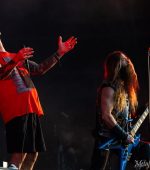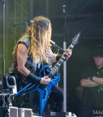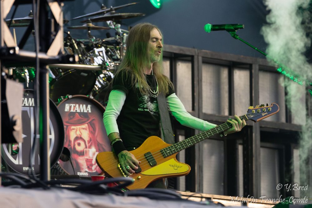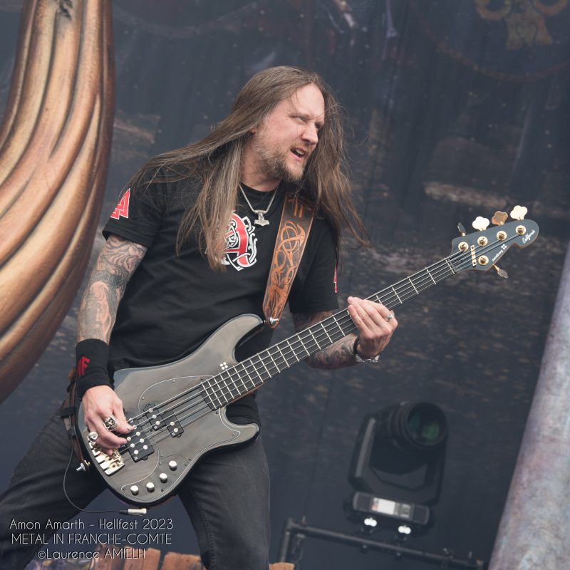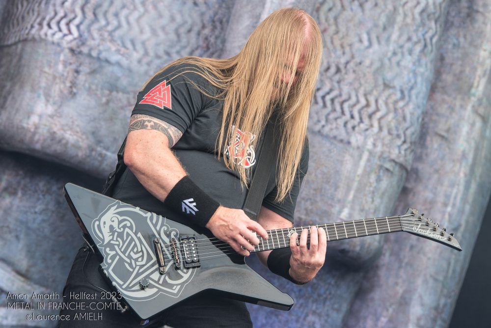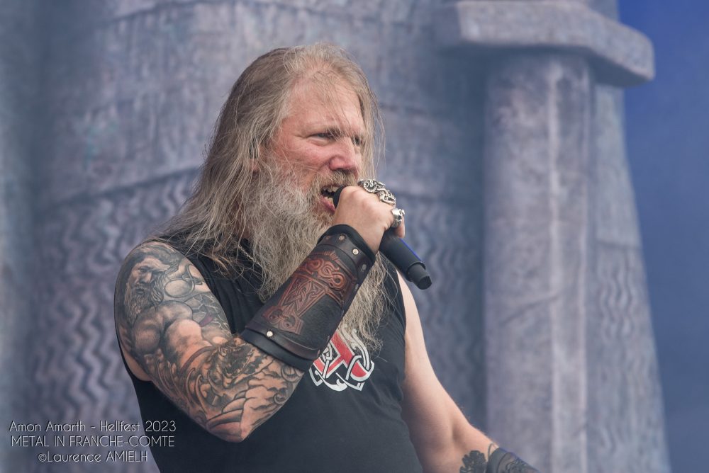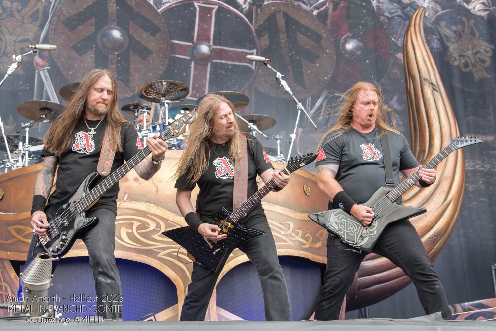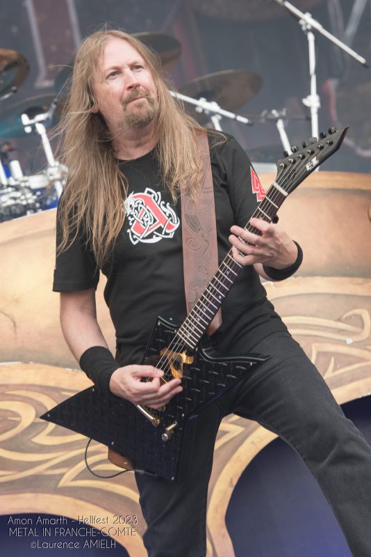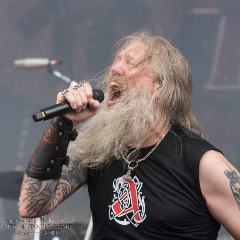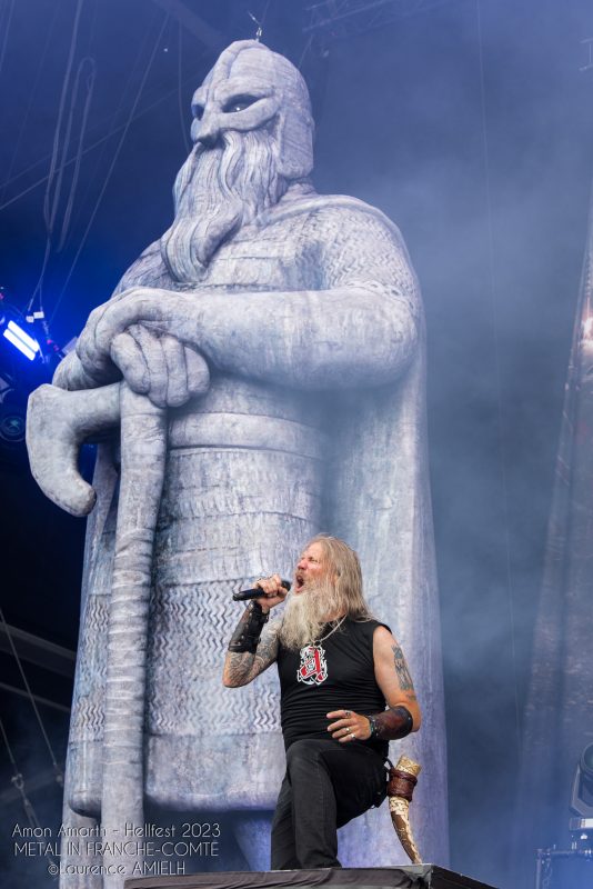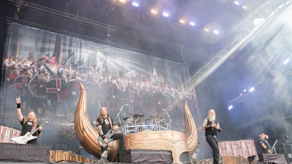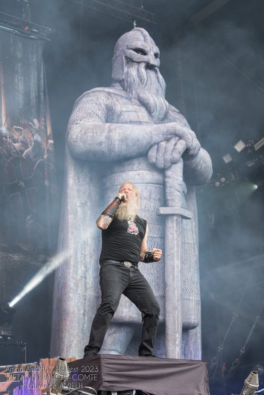 Après cette déferlante de lycra, il est temps pour AMON AMARTH de remettre un peu d’ordre dans la fosse. Un douzième album studio, baptisé “The Great Heathen Army”, est pour ces Vikings une bonne excuse pour remettre le couvert sur la scène du Hellfest ! La scénographie est remarquable comme toujours, incluant un immense casque nasal à cornes en milieu de scène, servant de support à la batterie de Jocke WALLGREN, et 2 gigantesques statues grises de barbus casqués flanquées d’immenses glaives. Le frontman Johan HEGG, à la voix si rauque, harangue la foule qui lui fait face, incluant quelques mots de français dans son allocution en anglais : les Cornes du Diable se lèvent à perte de vue. Les statues grises laisseront place un peu plus tard à 2 proues de Drakkars du plus bel effet ! Pendant que les flammes ou les jets de fumée embrasent l’avant-scène, une partie du public, plein d’humour, s’est assis par terre et rame en rythme ! Sur scène on a cette fois droit à un combat à l’épée par 2 barbus et cotte de maille. Un show grandiose de Death Metal (non non, pas de Metal Viking !!) qui vous prend aux tripes jusqu’à la dernière note.