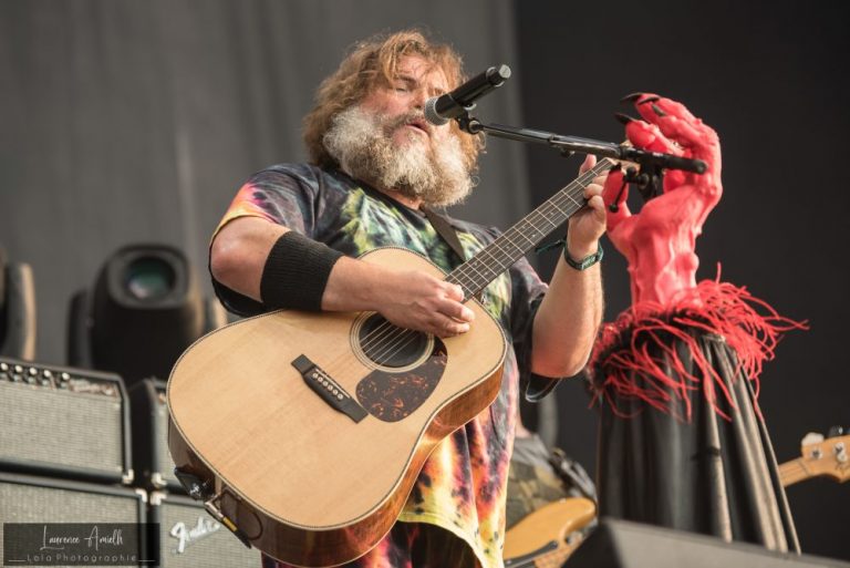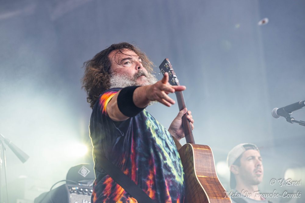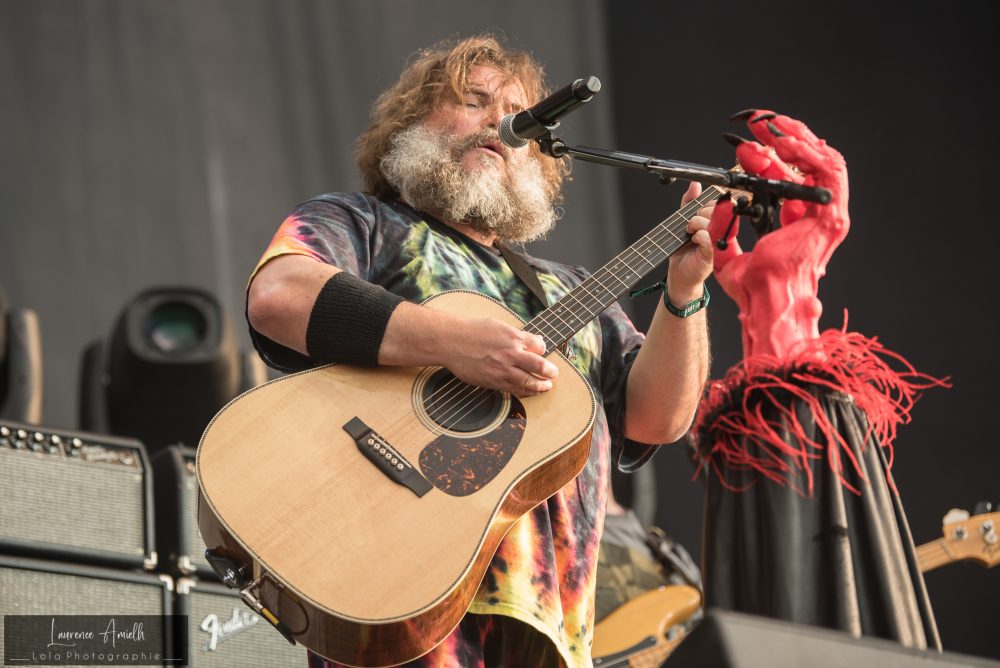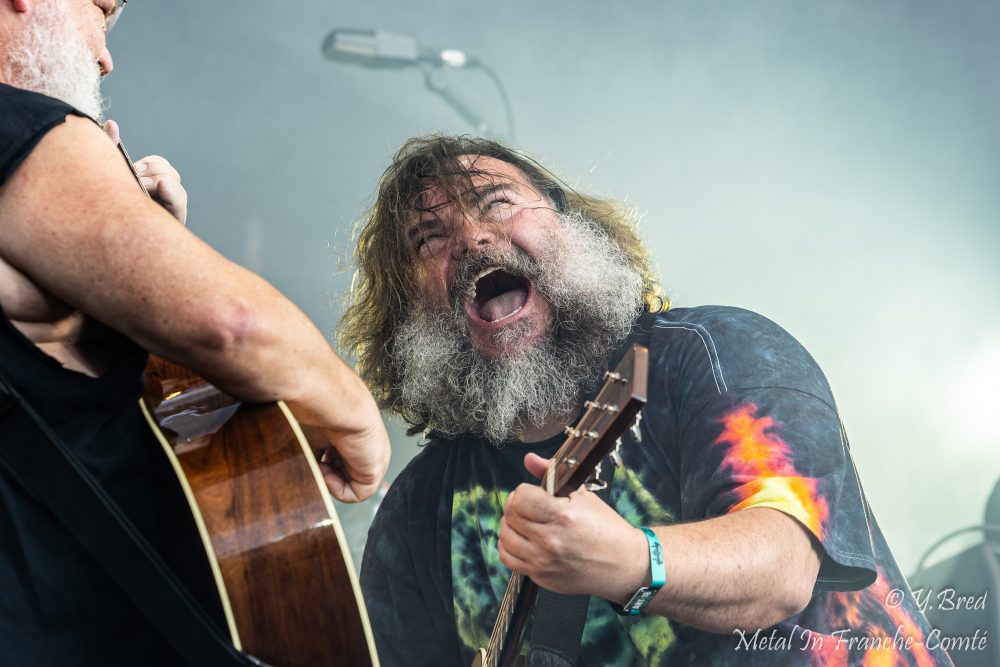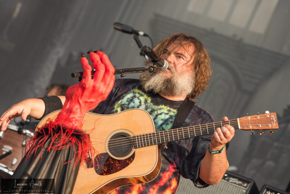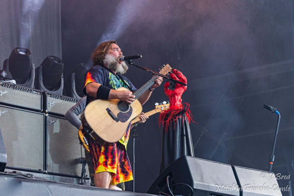Comment ? Vous ne connaissez pas le groupe qui veut devenir le plus grand groupe de rock de l’histoire ? (je dis bien qui « veut », pas qui « est »). J’ai le plaisir de vous présenter les TENACIOUS D, qui officieront ce jour sur la MAINSTAGE ! Groupe de Rock comique imaginé par Kyle GASS et Jack BLACK (que vous avez certainement vu dans « L’ amour extra Large« , « Rock Academy« , les « Jumanji » avec The ROCK, « Tonnerre sous les tropiques« , …). Dans le film « Tenacious D and the Pick Of Destiny » sortie en 2006, les 2 compères se mettent en quête du médiator de la destinée, fragment d’une dent de Lucifer, et qui a permis aux plus grandes légendes du rock de devenir ce qu’elles sont. Leur quête n’est pas sans embûche et autres remises en question, vous vous en doutez bien. Leur concert est tout inspiré de cette histoire. C’est pas souvent qu’on a 2 guitares acoustiques côtoyer une électrique, et pour des riffs et mélodie qui valent franchement le coup. M. Jack BLACK, tout de flammes vêtu et son acolyte Kyle GASS, nous servent un opéra rock décoiffant et rafraîchissant, assorti d’un humour potache qui ne déplaît pas à l’assistance (allant même jusqu’à citer « The Number of the Beast » pour engueuler son responsable pyrotechnique). Les gags et les morceaux s’enchaînent, et l’énergie du duo ne faiblit pas.