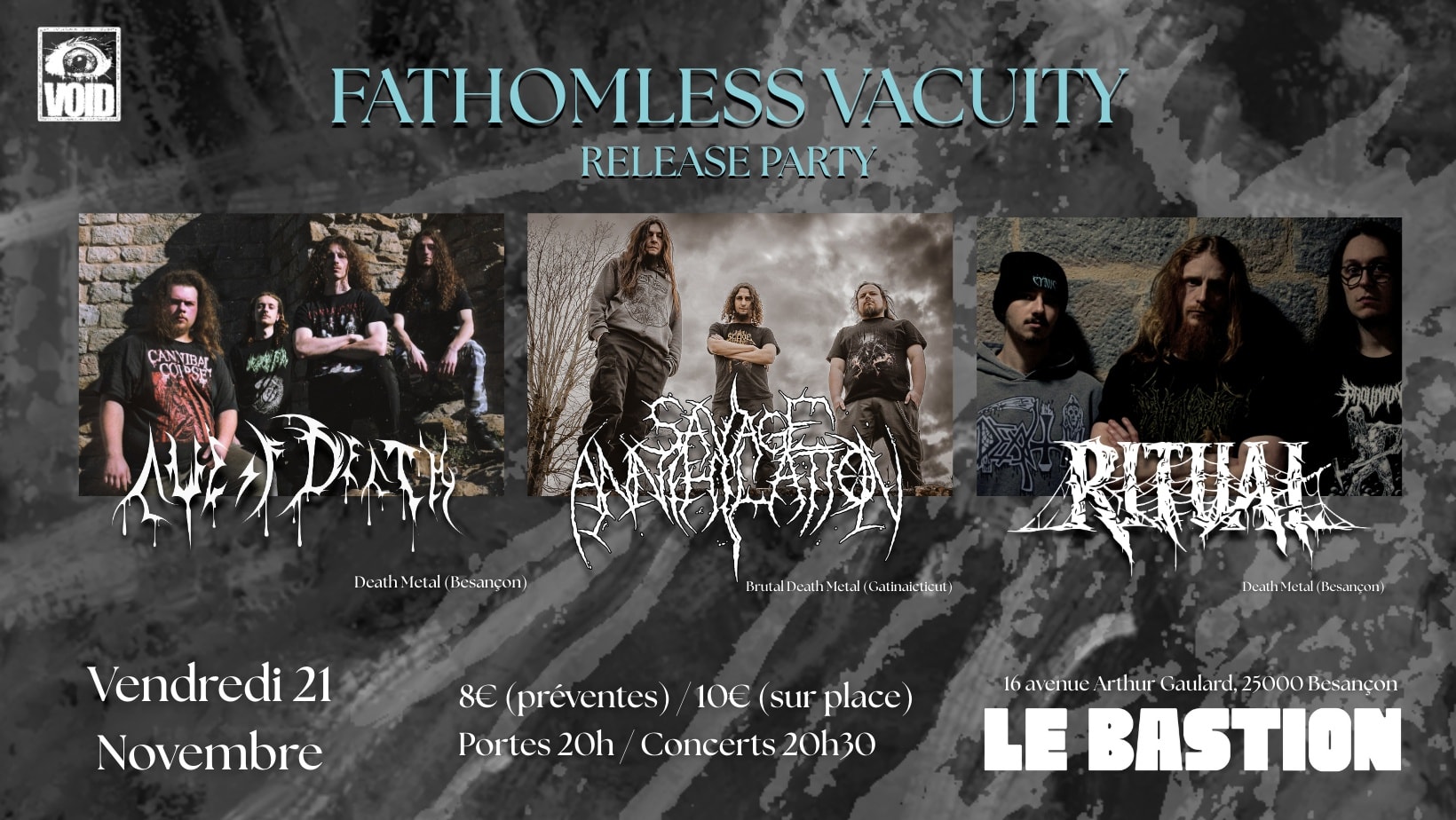 Besançon, ville de Death Metal ! La scène death metal de la ville est en effet très active, avec des groupes qui se démarquent par leur énergie et leur créativité. Parmi les groupes notables, on peut citer : Dieresis et sa brutalité implacable, Swarmageddon et leur approche moderne du death metal. Exhorted qui propose un death metal/thrash metal puissant, Abyssal Ascendant qui explore les profondeurs du death metal technique, Kymris qui propose un death metal mélodique avec des sonorités folk black metal et Awe of Death qui impose son style brutal et intense. Mais aujourd’hui, nous allons nous concentrer avec cette interview sur un autre groupe prometteur de la ville, Ritual, qui vient de sortir son premier album intitulé « Fathomless Vacuity«