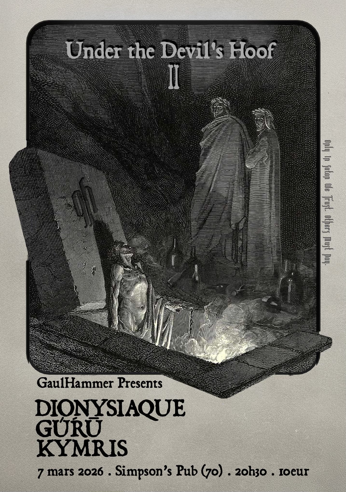 Les deux prochaines dates au Simpson’s Pub sont très importantes pour l’association. Le patron est un personnage à part entière, et le lieu correspond exactement à ce que j’espère retrouver lorsque je vais à un concert. La date avec Öxxö Xööx et Déhà est particulière : c’est la première fois depuis 2008 que nous acceptons de faire partie d’une tournée. Habituellement, nous préférons créer nos propres dates afin de rassembler le plus de monde possible autour de nos événements. Cependant, je connais les musiciens. Öxxö Xööx (Ndlr : un groupe avec des membres qui on fait partie de Igorrr) a déjà joué en 2016 à l’Echo System avec Gaulhammer, et ce fut un moment incroyable. Déhà est quant à lui une personne profondément investie et dévouée à la scène (Ndlr : sa biographie sur metal-archives est totalement impressionnante avec entre autre Dropdead Chaos, Wolvennest…) Il nous était donc impossible de refuser. Vous pourrez les voir le 13 février. Concernant la date du 7 mars, venez nombreux également. Dyonisiaque, Gũrù et Kymris : c’est un rendez-vous à ne pas manquer.