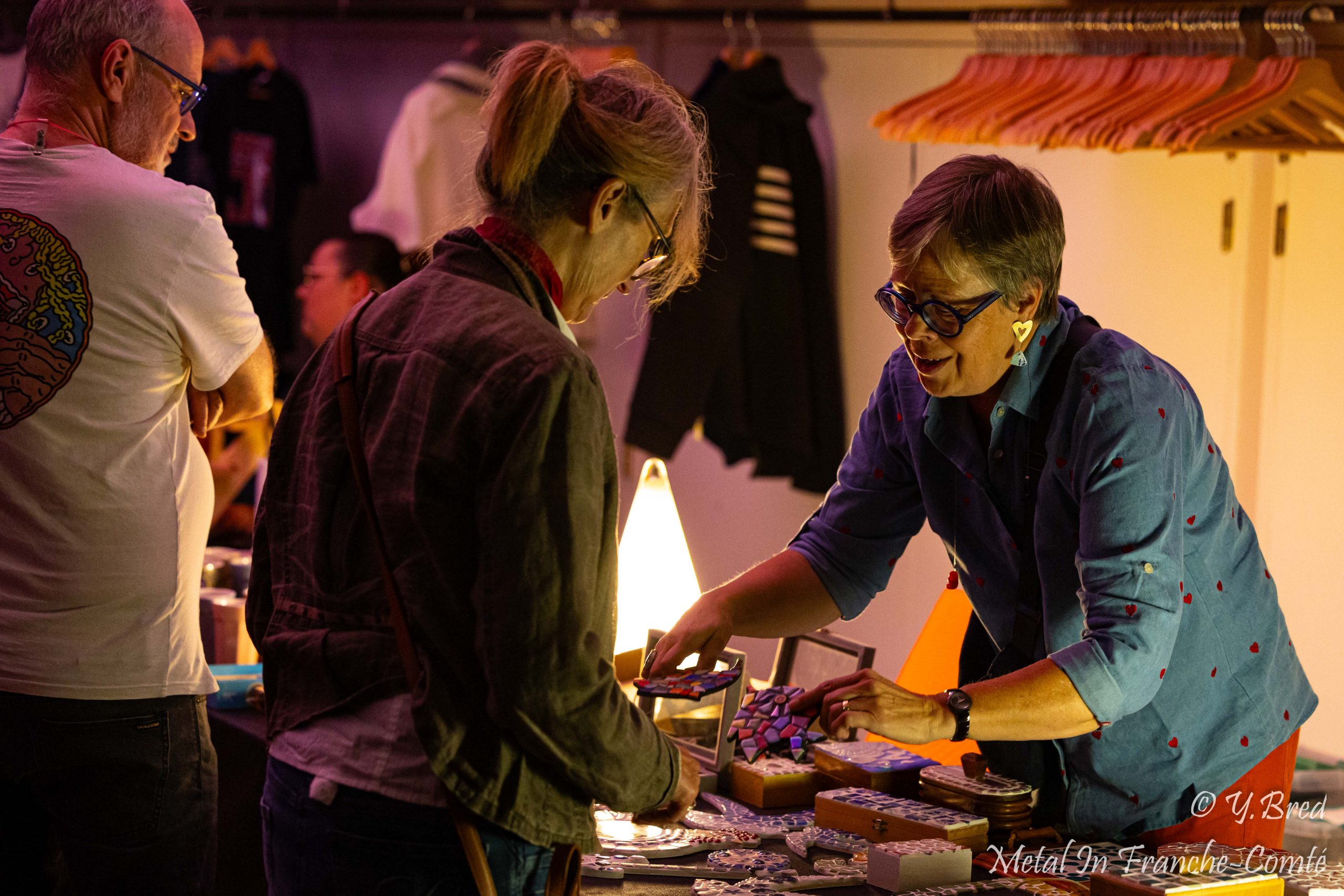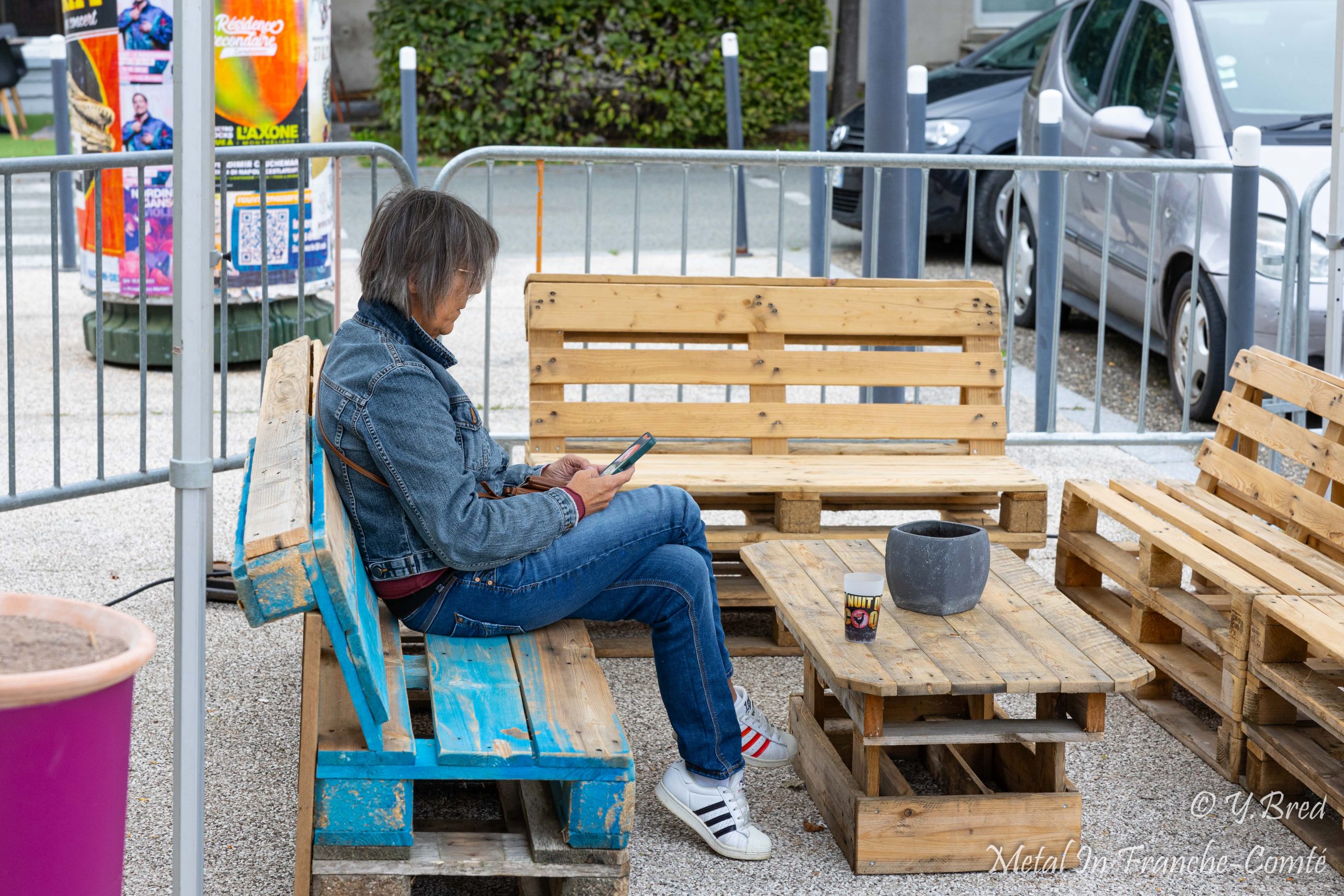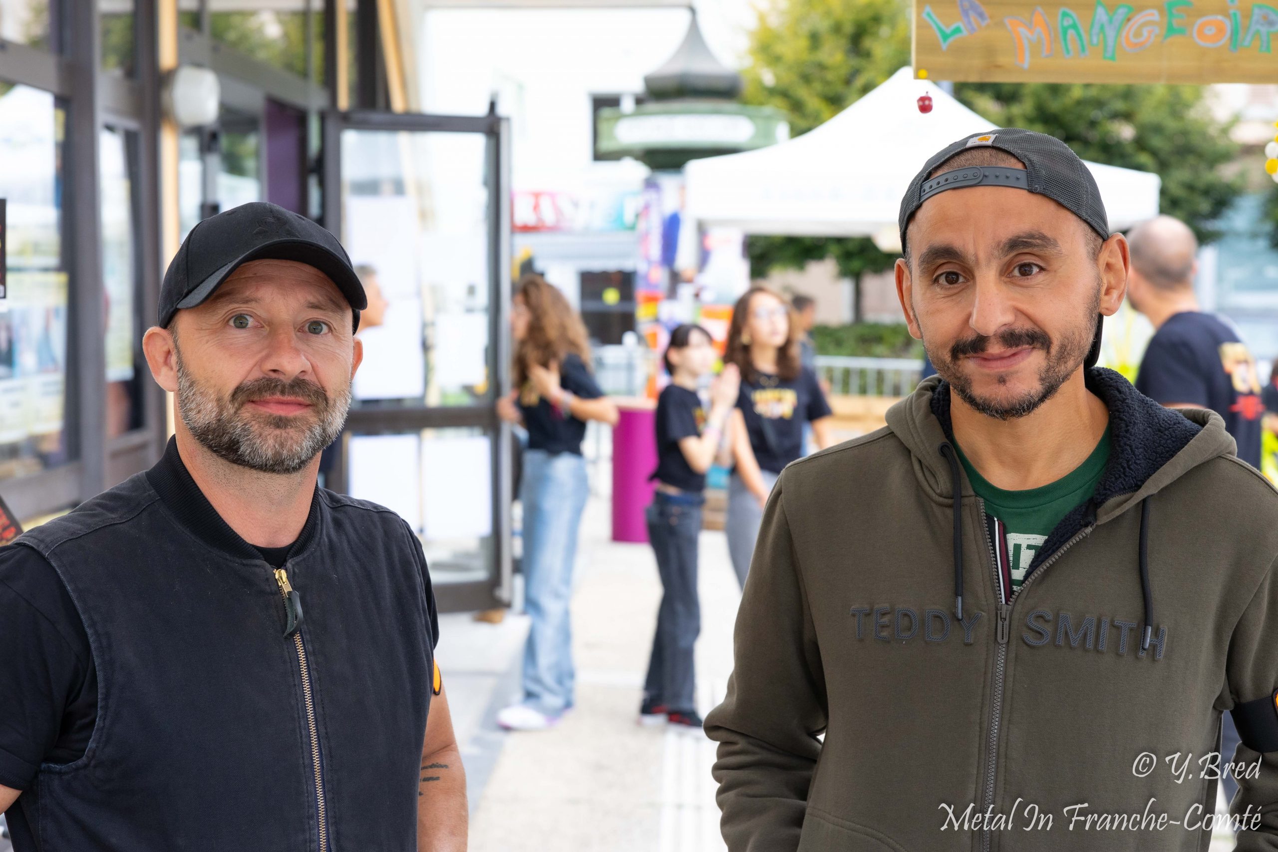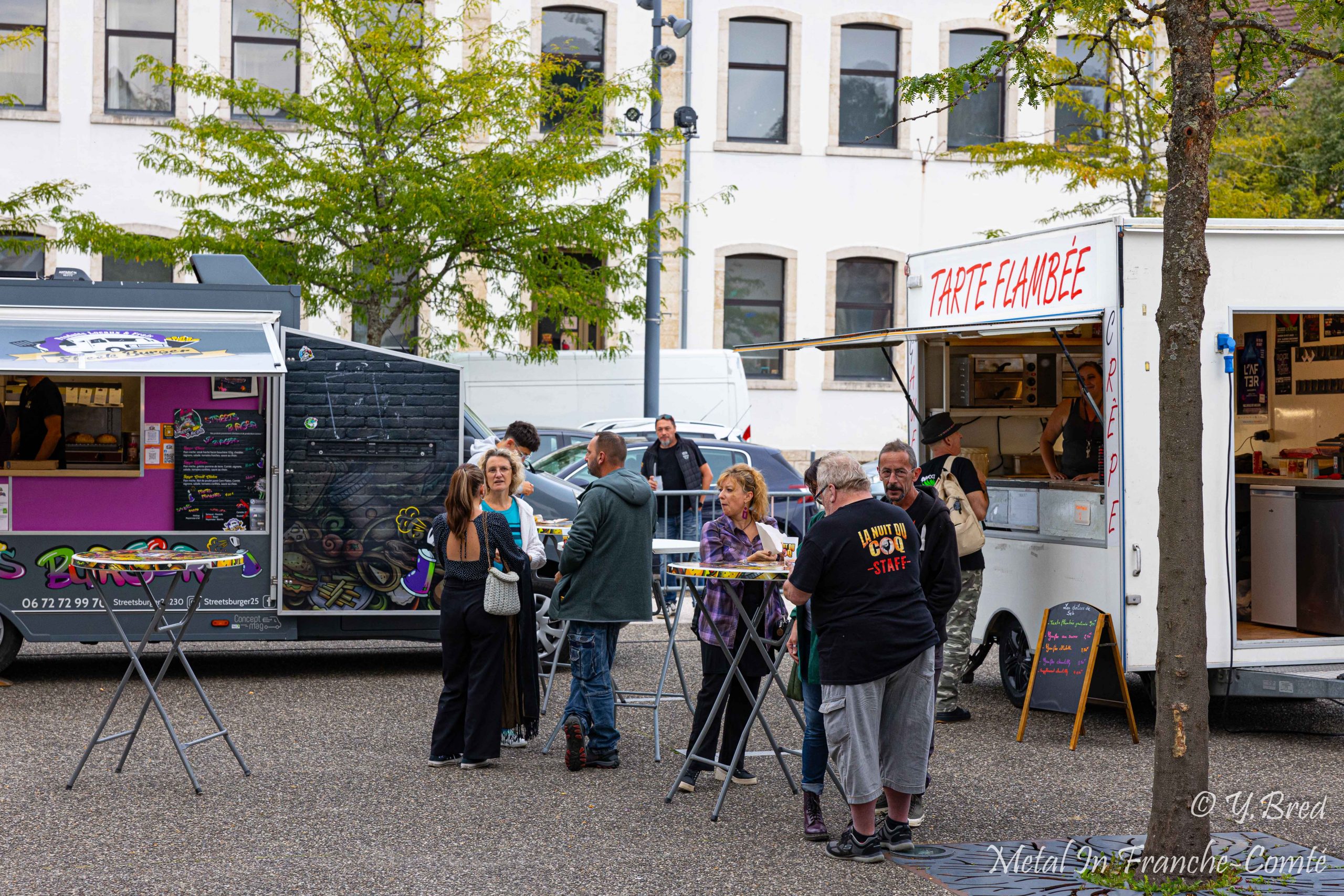 J’arrive vers 18H30. Tranquille. Des bénévoles pour me guider jusqu’au parking… de l’école, réquisitionnée pour l’occasion. A l’entrée de la salle, 2 Food trucks trônent sur la place. Burgers, frites, tartes flambées et gaufres me mettent déjà en appétit. Dans les murs à l’étage, on a des artisans locaux, le merch, et le bar. Pas encore grand monde, mais nous sommes vendredi, alors sans doute que beaucoup viennent tout juste de quitter le boulot (comme votre serviteur).