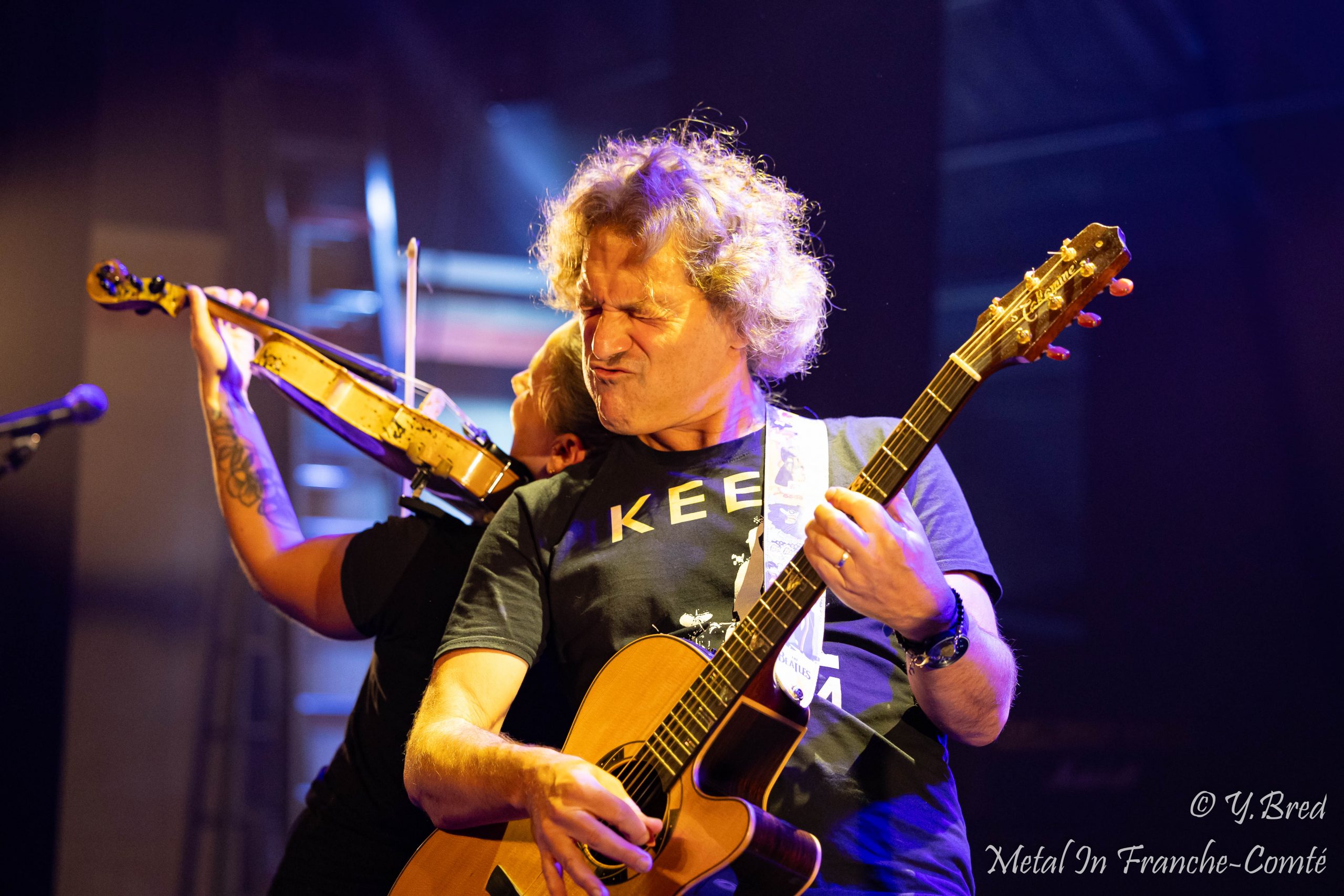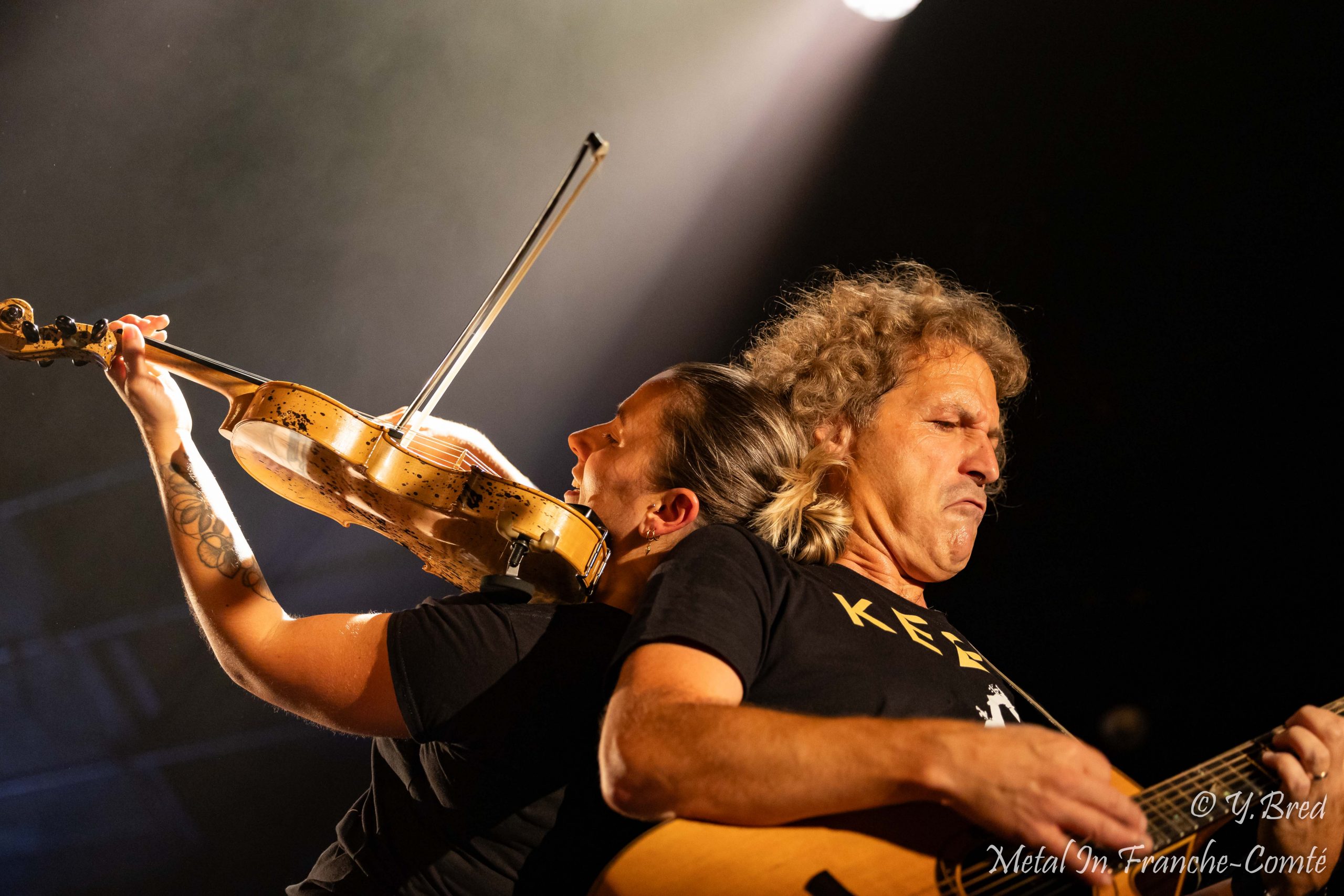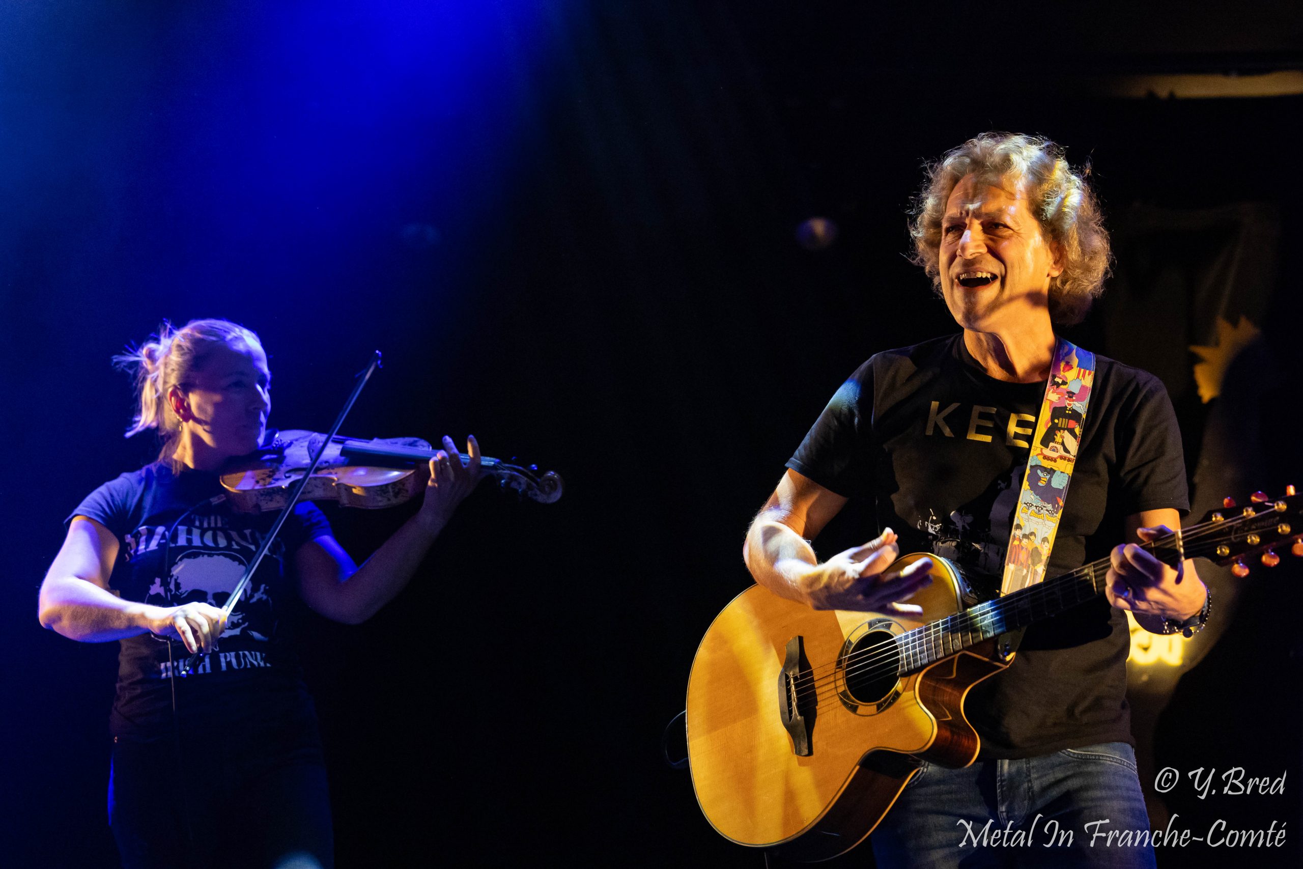 Le second groupe de la soirée est aussi le 1er duo de la soirée. Les DANGEROUSLY LIVE font dans le rock celtique acoustique. Ce n’est autre que 2 membres de FFR (Celtic Fiesta). Imaginez-vous dans un pub, à siroter une Guinness, et sans vous en apercevoir vous vous faites gentiment gagner par la musique de fond, puis vous vous surprenez à frapper du pied en rythme. Et bien c’est exactement ce qui vous arrive ce soir. L’énergie du duo, les mimiques de Martial au chant et à la guitare et la façon dont il invite le public à participer, les coups d’archet et la sourire de Marine, donnent définitivement le ton festif et convivial à cette soirée.