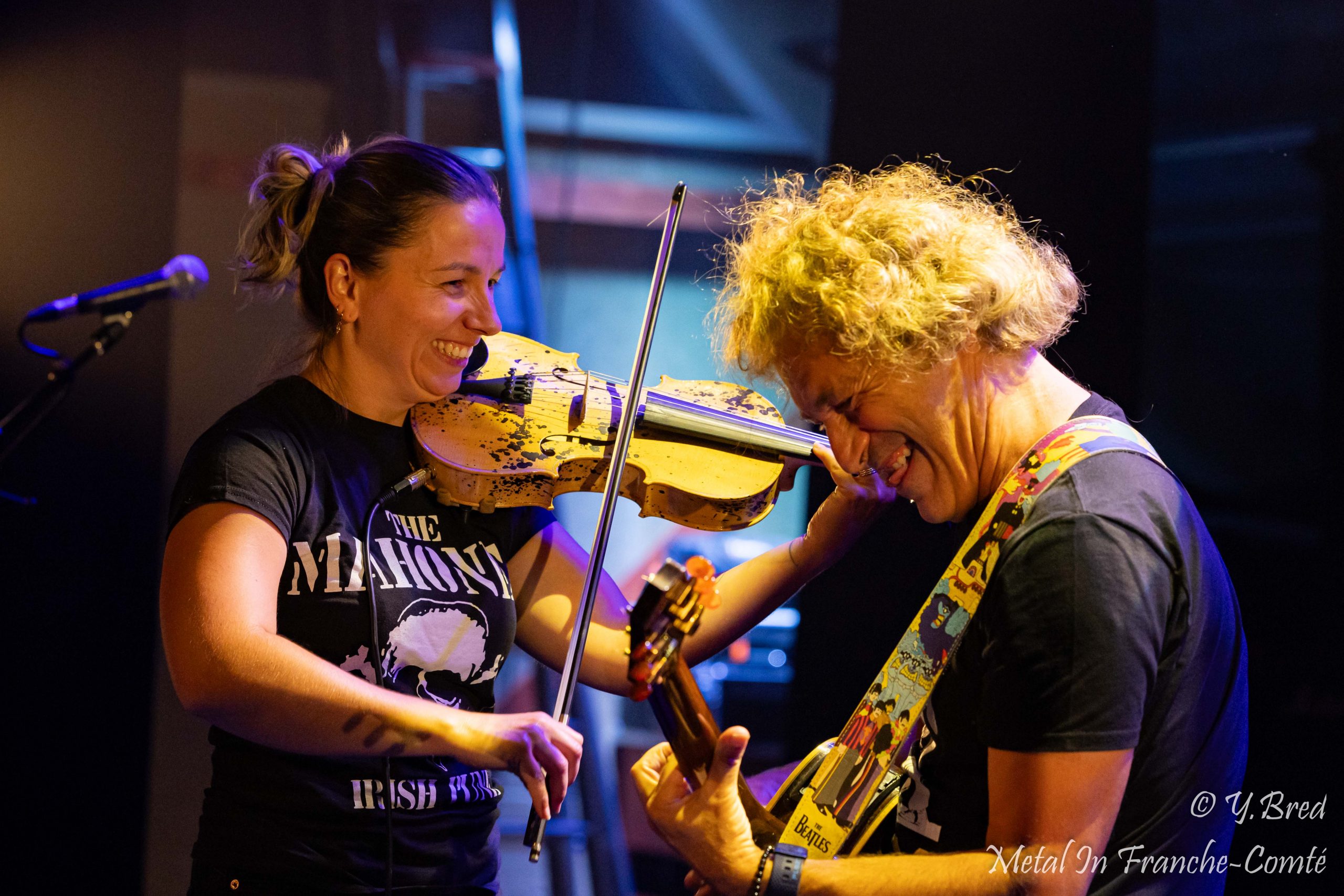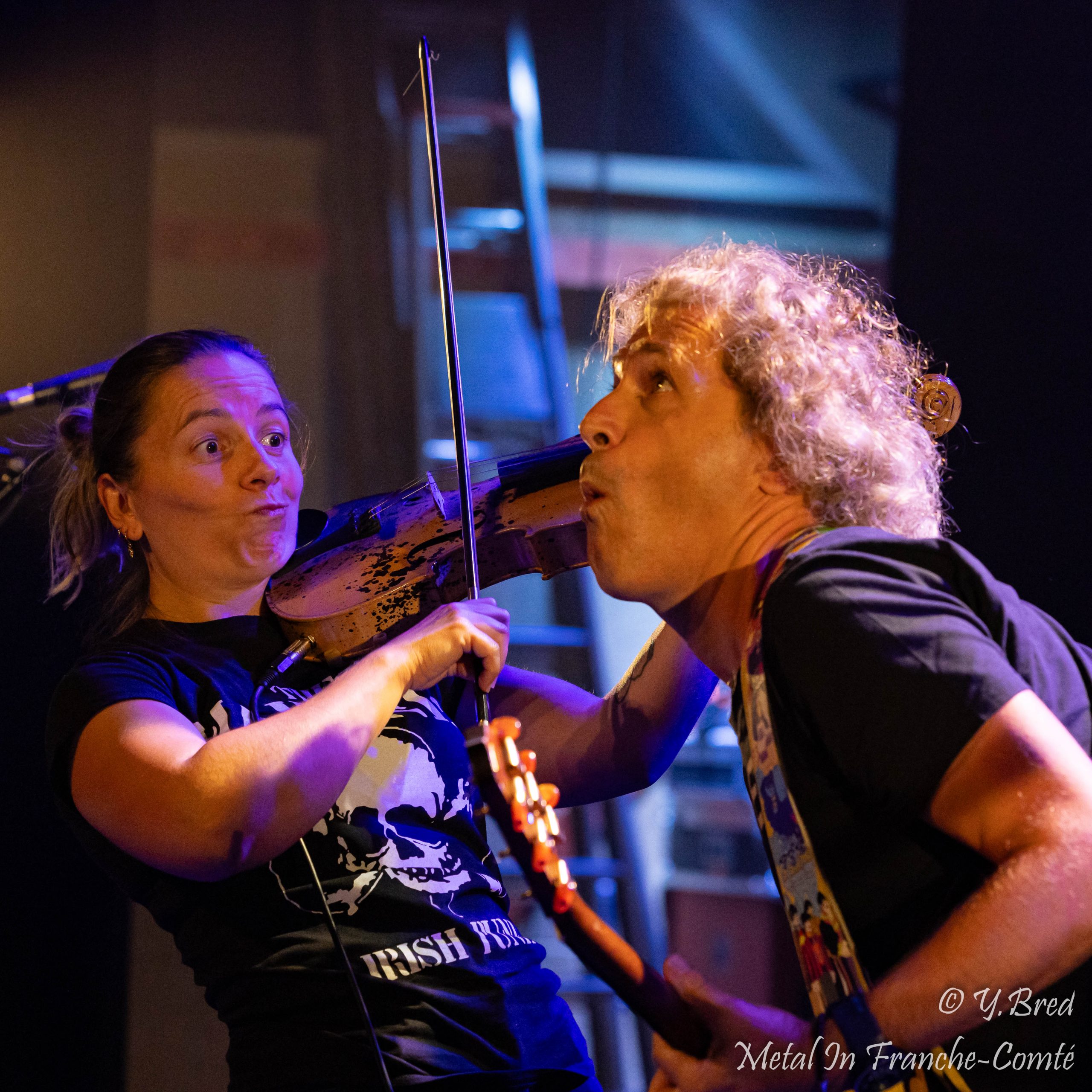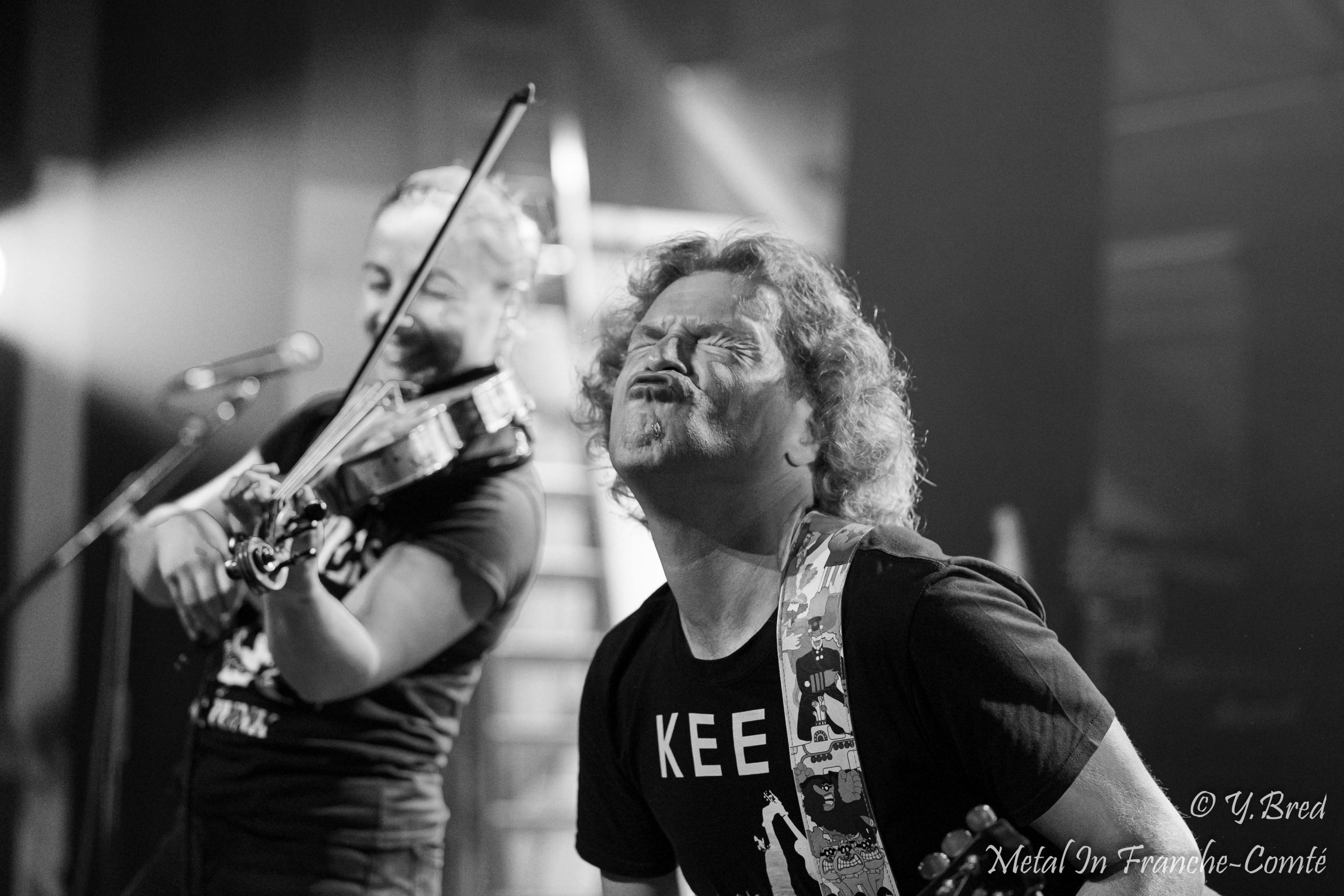 Le second groupe de la soirée est aussi le 1er duo de la soirée. Les DANGEROUSLY LIVE font dans le rock celtique acoustique. Ce n’est autre que 2 membres de FFR (Celtic Fiesta). Imaginez-vous dans un pub, à siroter une Guinness, et sans vous en apercevoir vous vous faites gentiment gagner par la musique de fond, puis vous vous surprenez à frapper du pied en rythme. Et bien c’est exactement ce qui vous arrive ce soir. L’énergie du duo, les mimiques de Martial au chant et à la guitare et la façon dont il invite le public à participer, les coups d’archet et la sourire de Marine, donnent définitivement le ton festif et convivial à cette soirée.