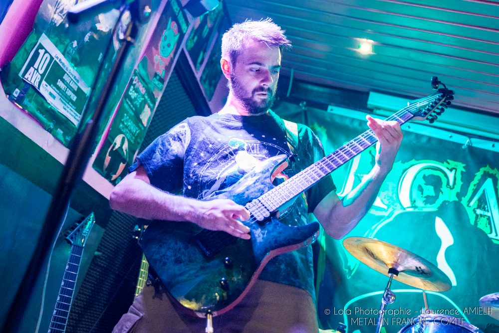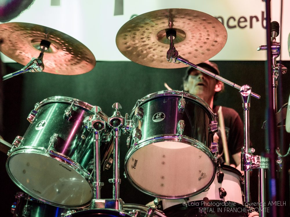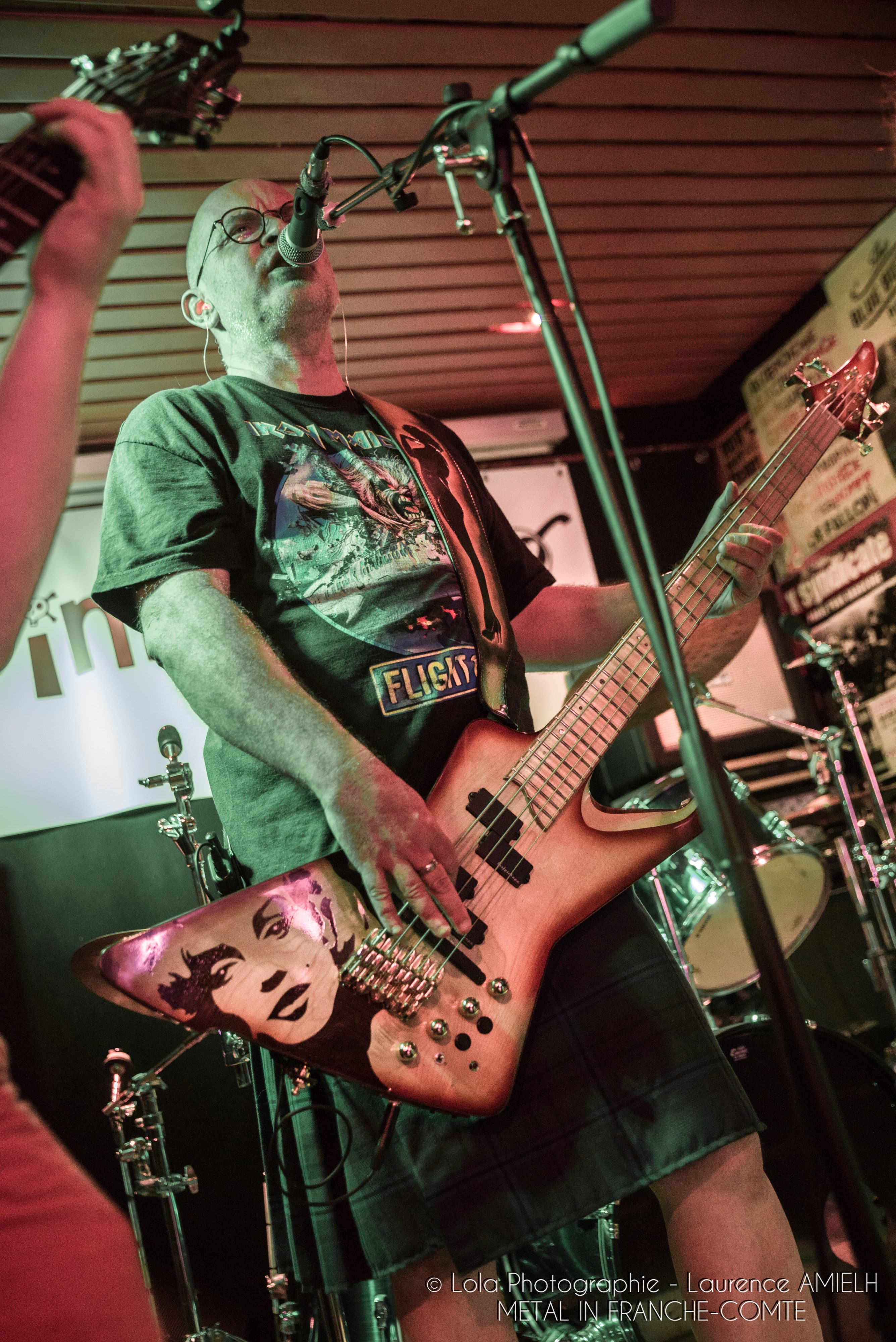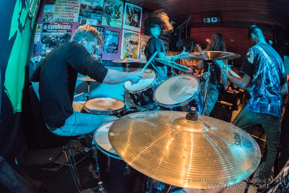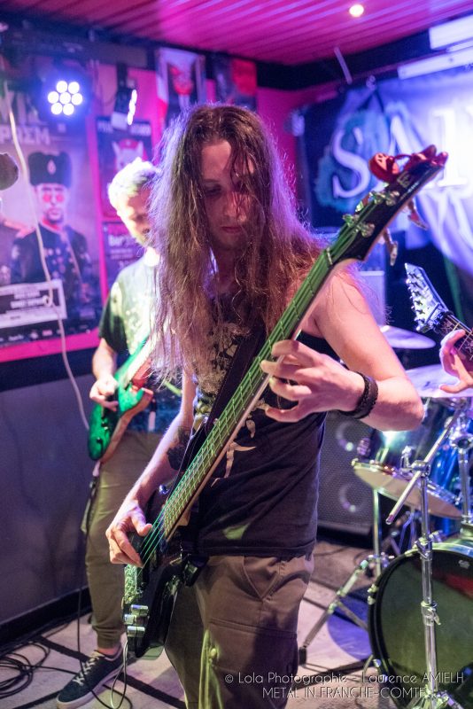 Et déjà le groupe suivant installe sont matériel sur la petite scène. C’est IRON SKULLS qui prend les manettes. Ils sont 4. Formés en 2017, ils répètent dans le garage de Nicolas, le batteur et se rendent sur leurs lieux de concerts à bord de leur vieux fourgon avec option « chaises de camping » à l’arrière ! D’influences plutôt heavy metal, leur set tourne autour de Motorhead, Metallica, Megadeth et Iron Maiden. Léo, Guitariste solo aussi doué dans l’art de faire chanter son instrument que dans celui de la lutherie, ayant lui-même créé sa propre guitare (pas celle de ce soir) a embarqué son père, jean, le chanteur, dans ce projet musical. Le 2e Nicolas, guitariste rythmique, est un ancien d’Osmose, pour les anciens qui ont connu ! Au fait, si vous êtes bassiste et que le style d’Iron Skulls vous intéresse, prenez contact : ils recrutent !