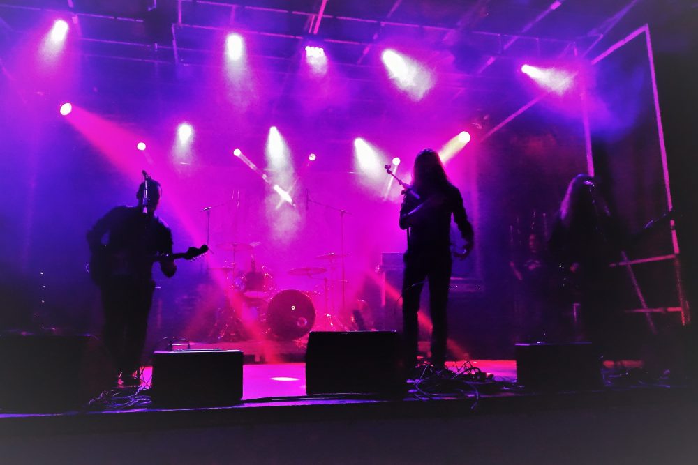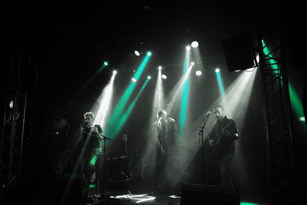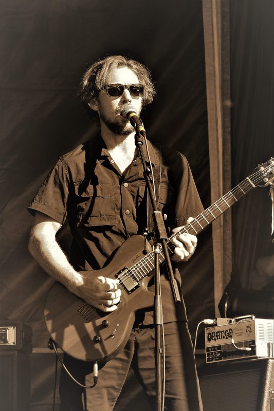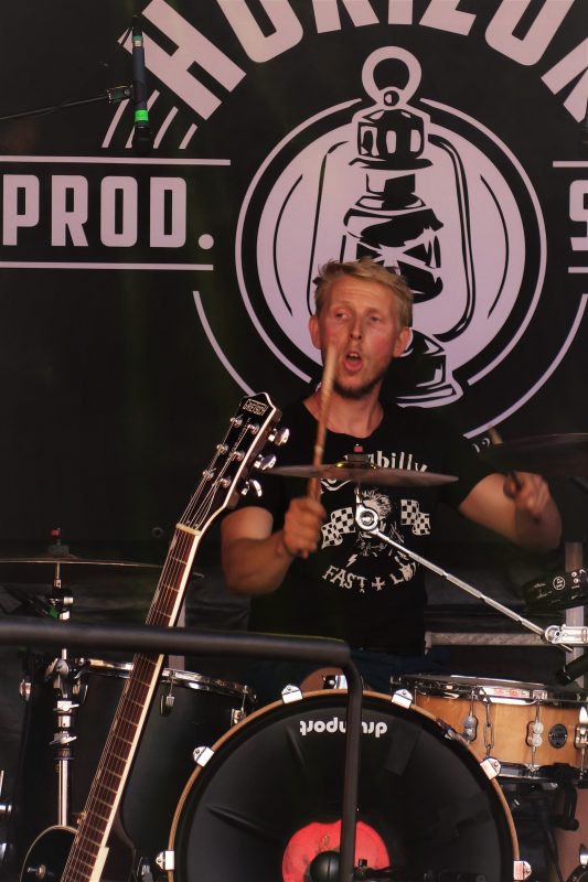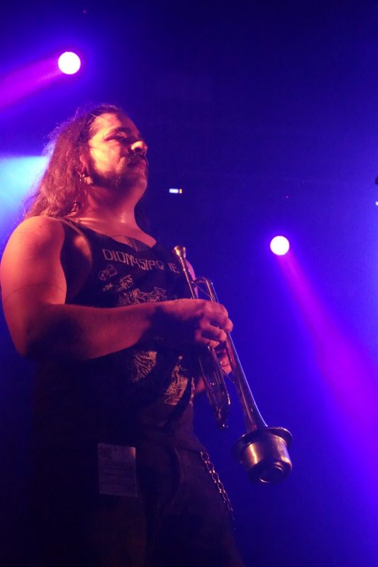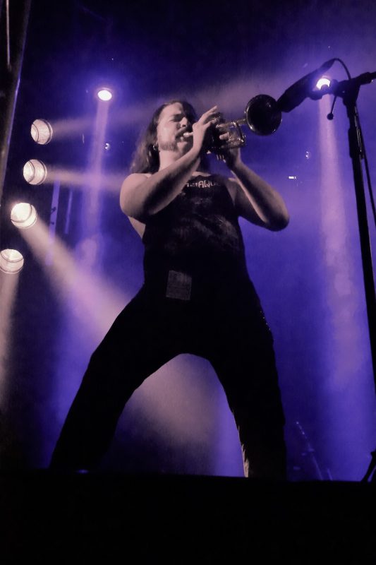 Pour le 3ème groupe à l’affiche (initialement 4ème ), place à Sandman Preacher, toujours à l’abri de la Poudrière, et il faut avouer qu’une ambiance dans le noir et plus intime que du plein air plein jour, sied à merveille à l’univers onirique et planant du combo. Par le passé, j’avais vu ce groupe en mode duo acoustique (au Catering aussi, dites donc !) et j’avais adoré. Cette formation à quatre, batterie-guitare-trompette, et deux voix, féminine + masculine, qui se répondent et s’harmonisent brillamment, donne un tout autre style, mais garde la même pureté et puissance, ponctuée par touches parfaites de la trompette de Ben, sur le devant de scène, lui qui officie souvent derrière les fûts dans d’autres groupes.