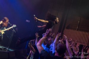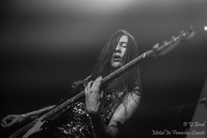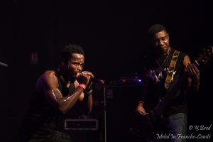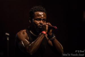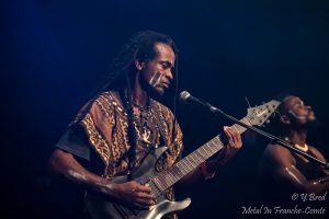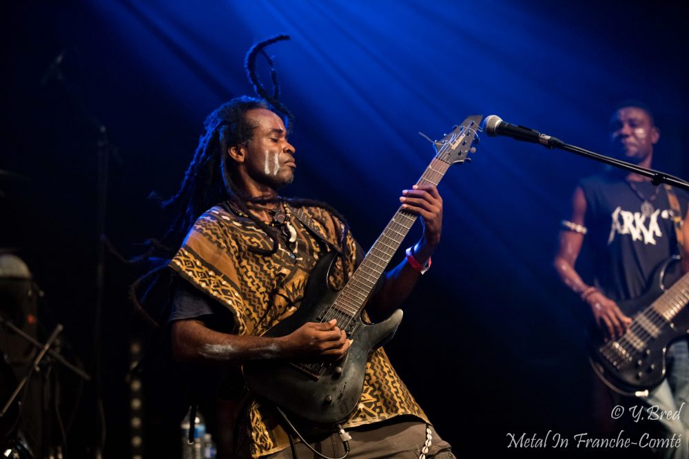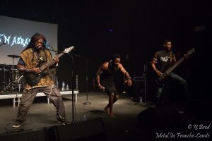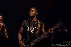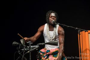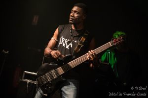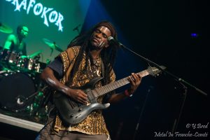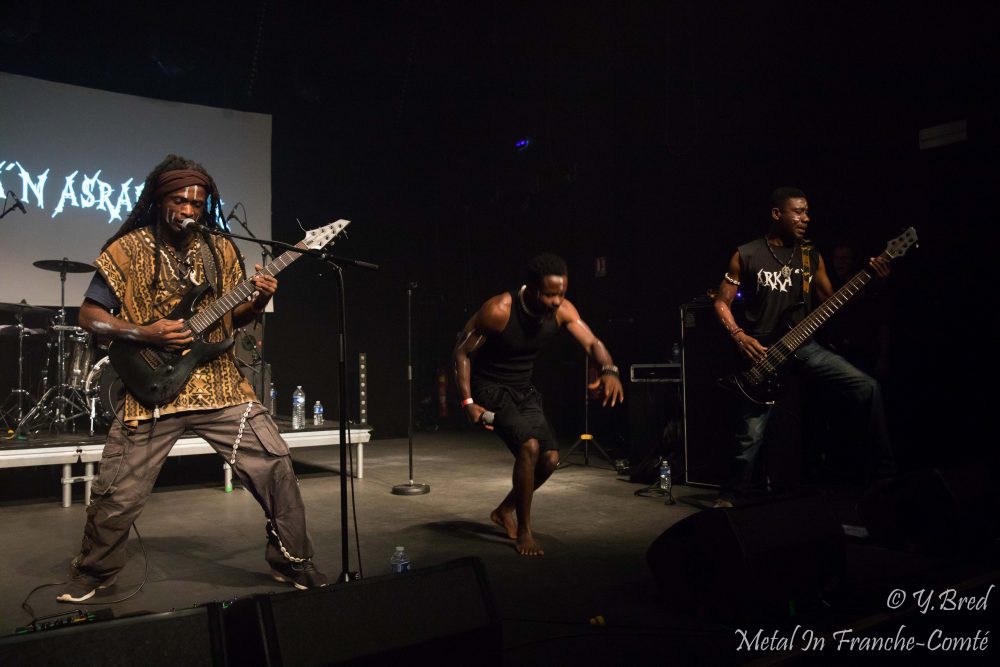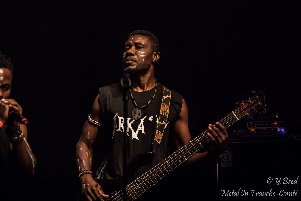 ARKA’N ASRAFOKOR a définitivement son son bien à lui. On y trouve de nombreuses alternances de chant clair et growlé, mais aussi son clair et saturé à la guitare, des passages rapés, de nombreux changement de rythmes, et avec une profonde inspiration africaine dans tout cela. Soyons franc, c’est quelque peu déroutant. En effet, à la différence d’un SOULFLY ou d’un SEPULTURA (version « Roots »), ce n’est pas du métal qu’avec des touches ou des rythmes tribaux… L’inspiration traditionnelle est ici beaucoup plus ancrée dans les titres, tant dans les sonorités que dans la composition et les arrangements. Les percus prennent plusieurs fois l’ascendant sur les instruments à cordes. Alors ça déstabilise un peu le public… qui d’ailleurs partira tout au long du set. D’environ 50 personnes au départ, on finira aux alentours d’une petite trentaine. Le groupe n’aura pas trouvé son public ce soir-là.
