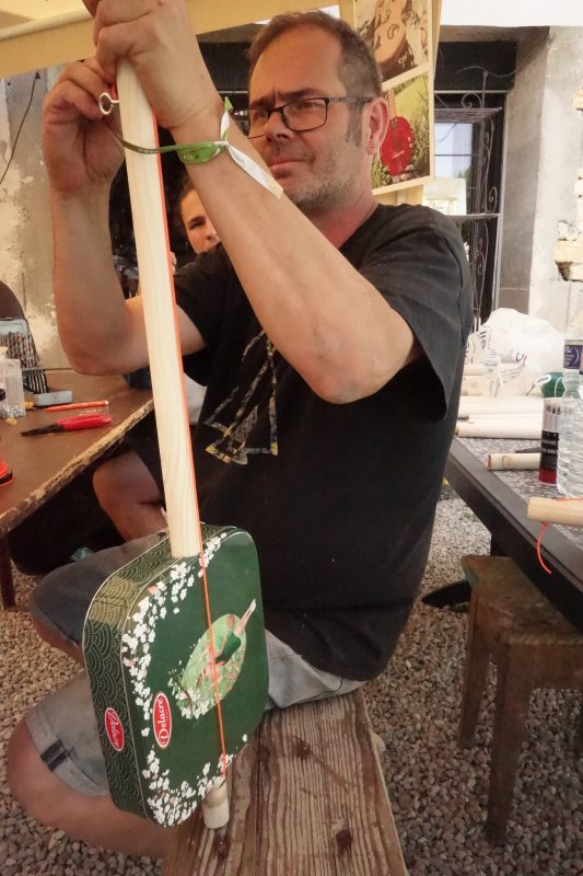 Au programme : dès le début d’après-midi, atelier de confections de Cigare Box One string, instrument à une corde à partir de boîtes métal diverses et variées (gâteaux, sucreries, films vidéos, thé…) à destination des plus jeunes (mais parents et jeunes adultes aussi :-p, 10 instruments construits en tout !), restauration sucrée-salée-grillée et buvette (bière locale of course !, 40 kg de frites, 160 sandwiches et 200 crêpes englouties, une dinguerie !) pour enchaîner dès la fin d’après-midi avec de la musique Live.