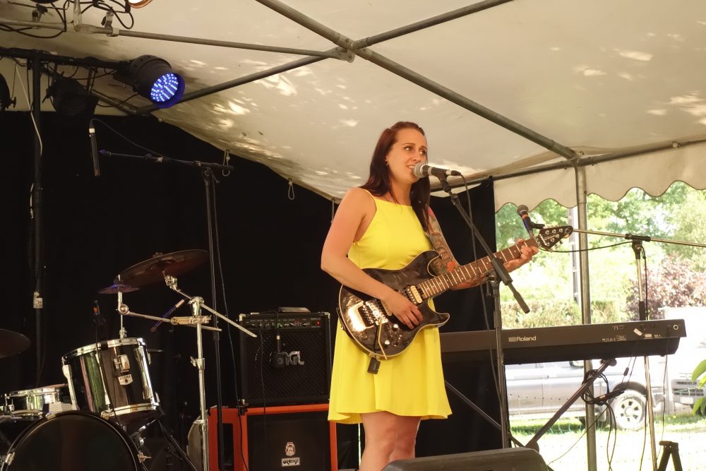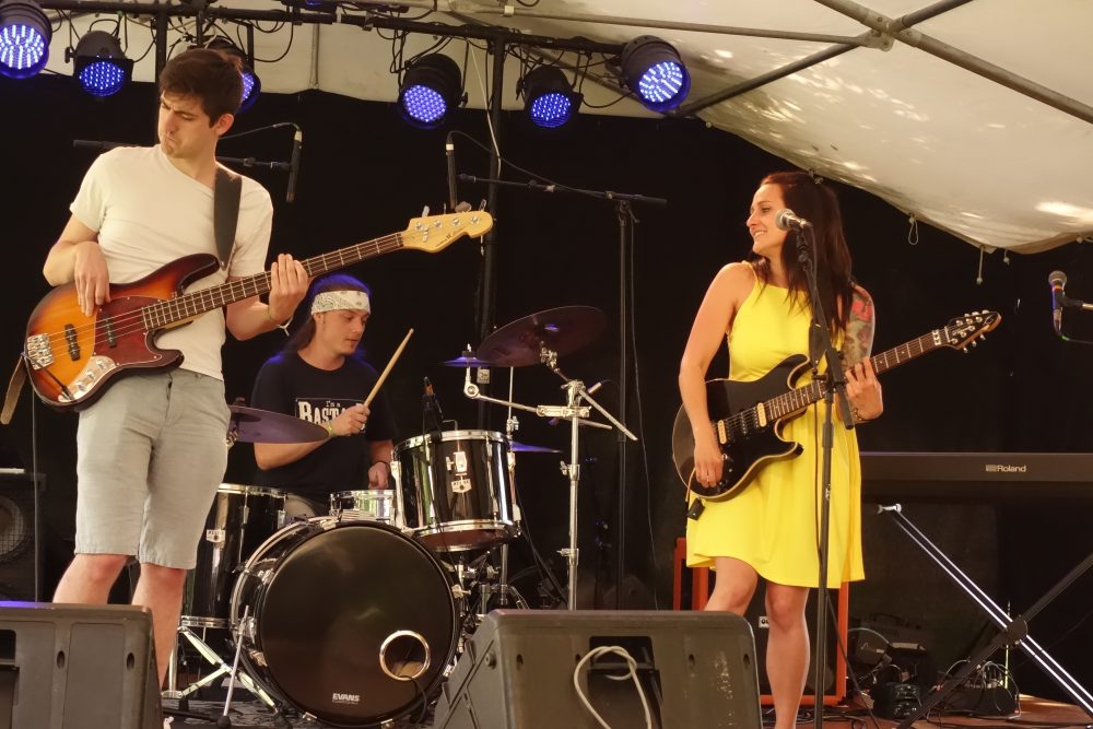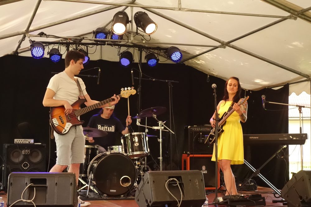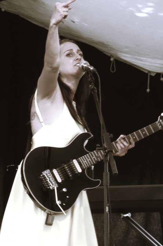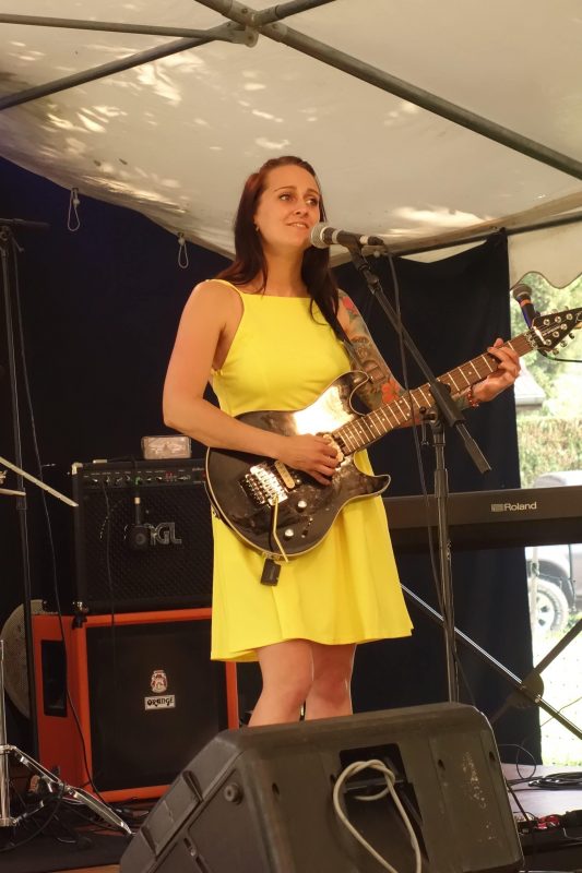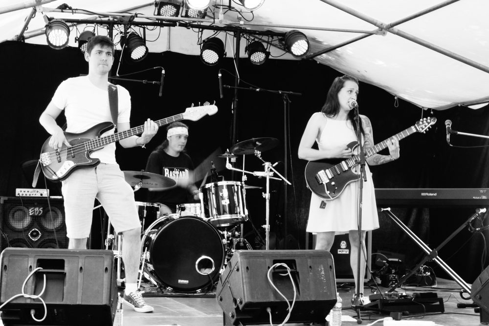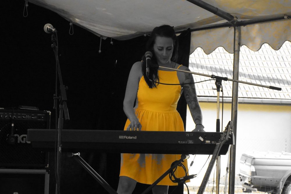 Pour débuter, c’est la lumineuse Caroline Van Roos qui est montée sur scène, en solo tout d’abord, comme elle en avait l’habitude jusque là, mais très vite rejointe par sa nouvelle team de musiciens, Lucas à la basse, et Flô (qu’on ne présente plus !) à la batterie, mais cette fois dans un style plus assagi 😉 Une première en config’ électrique et à trois, Caroline passant de la guitare au piano selon les titres, toujours aussi spontanée et aussi mignonne que ses paroles sont tour à tour poétiques ou piquantes et pinçantes ! Un set un peu court mais réussi, permettant au public de se densifier peu à peu en cette fin d’aprem’.