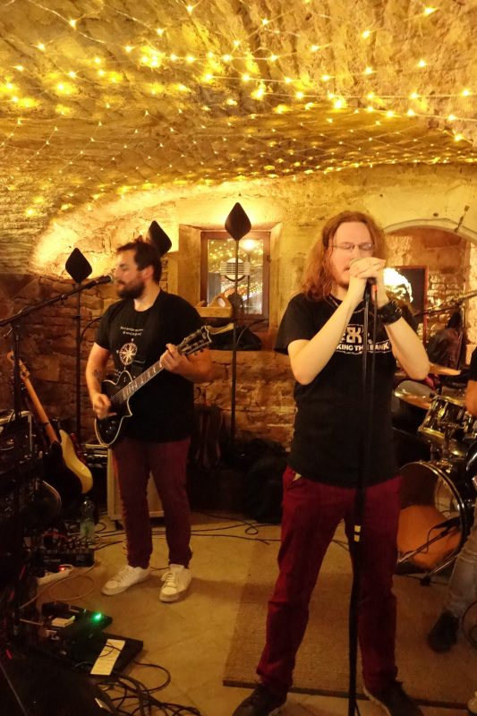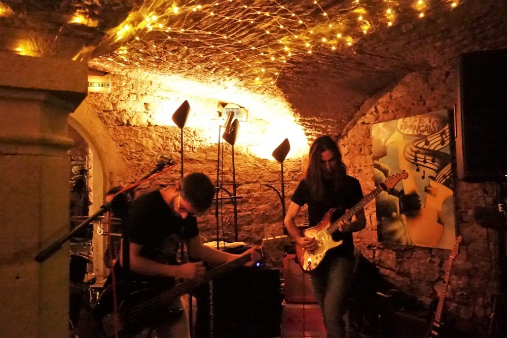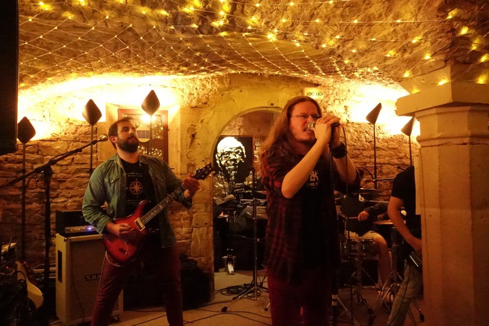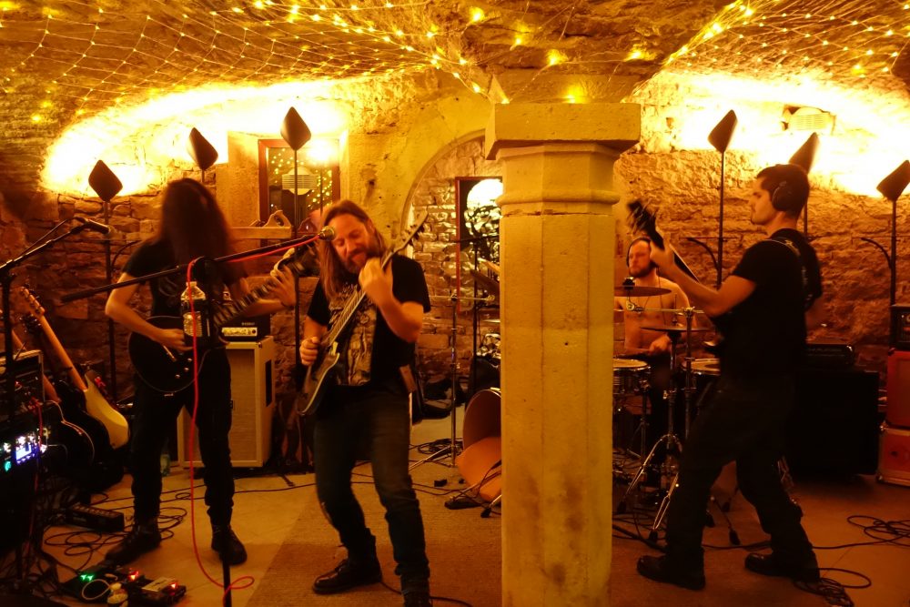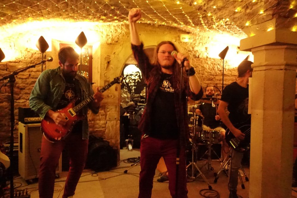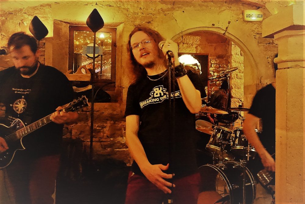 Commençons par la prestation de nos metalleux régionaux, Breaking The Bank, 5 gaillards qui délivrent du rock metal progressif et qui ont enfin eu l’occasion de présenter en LIVE leur nouvel EP (fortement recommandé !!) « Bankable », sorti en décembre 2019 (soit juste avant le début du boxon…et les annulations en cascade). L’occasion de délivrer plusieurs titres issus de cet EP (et du précédent, sauf erreur) et également de présenter leurs toutes dernières créations, à une cave plutôt très bien remplie (et participative) malgré ce jour de semaine d’automne. Un bon moment de kiff, côté public comme côté scène (au sol) du CF !