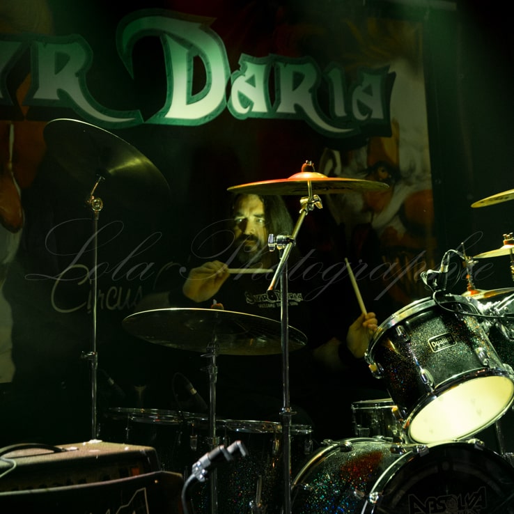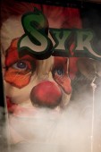 Les Mulhousiens de Syr Daria entrent en scène. Le clown de Circus of life, en grand format derrière le batteur est rappelé sur les sangles des guitares.